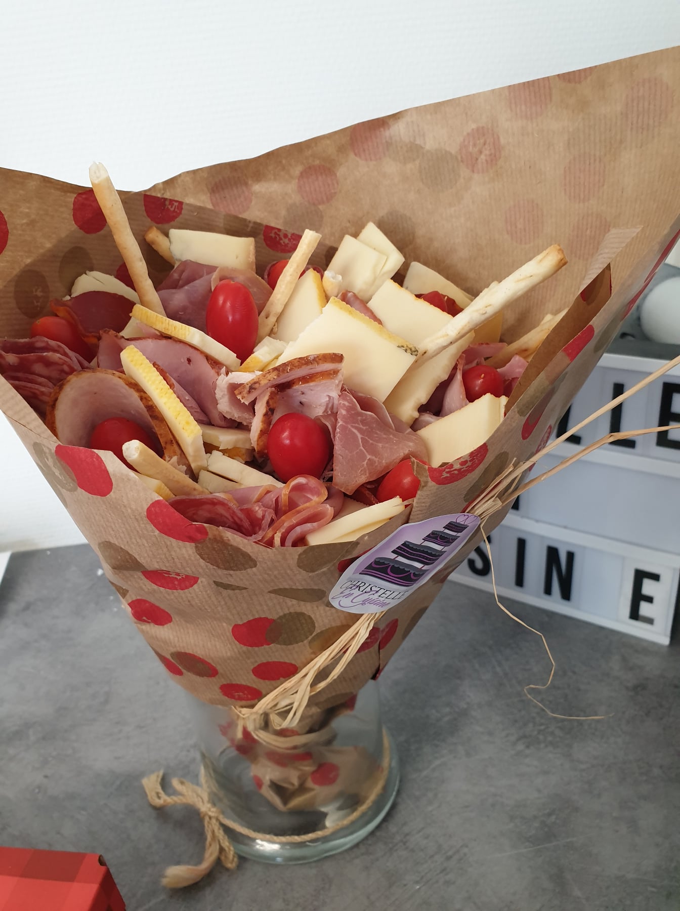 La chef, connue sous le nom de « Christelle en Cuisine » a inventé ce bouquet en le composant avec 8 tranches de fromage et 8 tranches de charcuterie par personne.